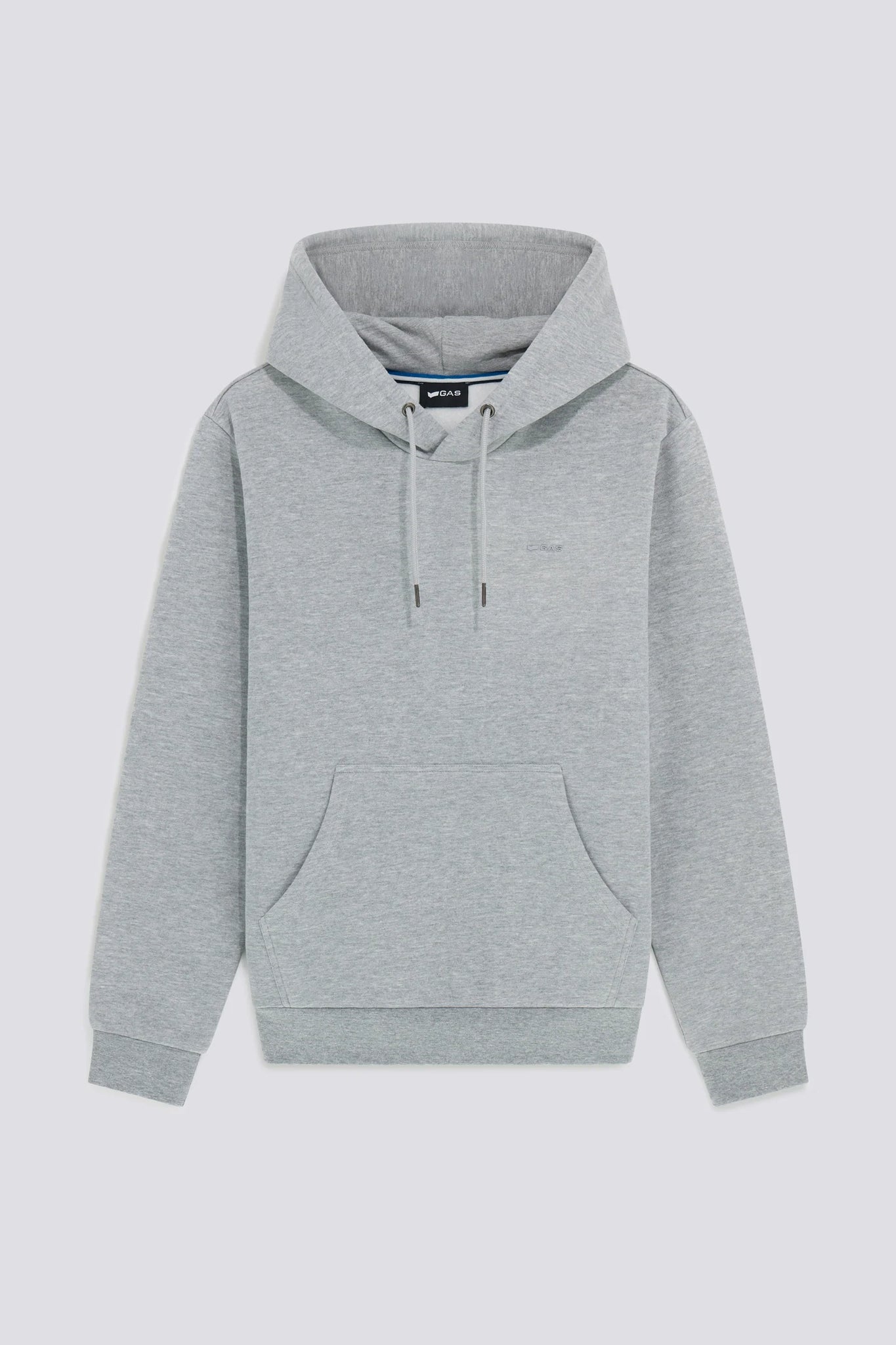 Sudadera de hombre regular fit con capucha y bolsillo tipo canguro, confeccionada en una felpa de mezcla de algodón con un tacto suave y compacto. El logo en relieve tono sobre tono en el pecho y la cinta de sudoración a rayas añaden carácter a una prenda esencial para la temporada. Perfecta con denim suelto o jogger para un look cómodo pero nunca aburrido.